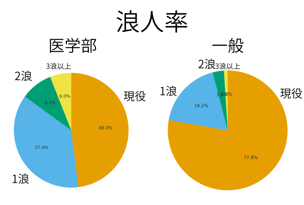 現役が48%、1年浪人37%、2年浪人9%、3年浪人以上6%。